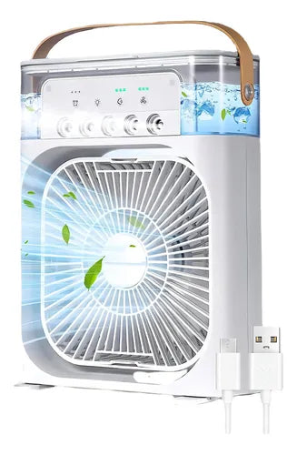 VENTILADOR HUMIDIFICADOR DE AIRE MULTIDIRECCIONAL LUZ LED PORTÁTIL